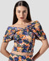 بلوزة مطبوعة مكشوفة الأكتاف بأكمام قصيرة. تتميز بتفاصيل ملتوية من الأمام وقصة ضيقة لإطلالة عصرية وأنثوية.