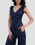 جمبسوت بدون أكمام بفتحة رقبة على شكل حرف V وتفاصيل ترتر تغطيه بالكامل. خصر ضيق وساقان واسعتان. سحاب خلفي مخفي للإغلاق. قطعة مميزة مثالية للسهرات.